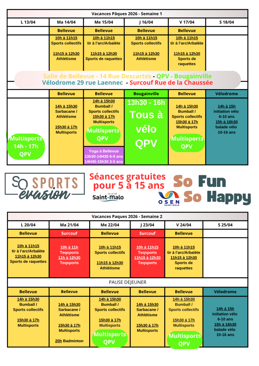 Du lundi au samedi pendant les vacances, retrouver l'équipe So Sports Evasion sur Saint-Malo autour de nombreuses activités destinées au enfants et ados de 3 à 17 ans...